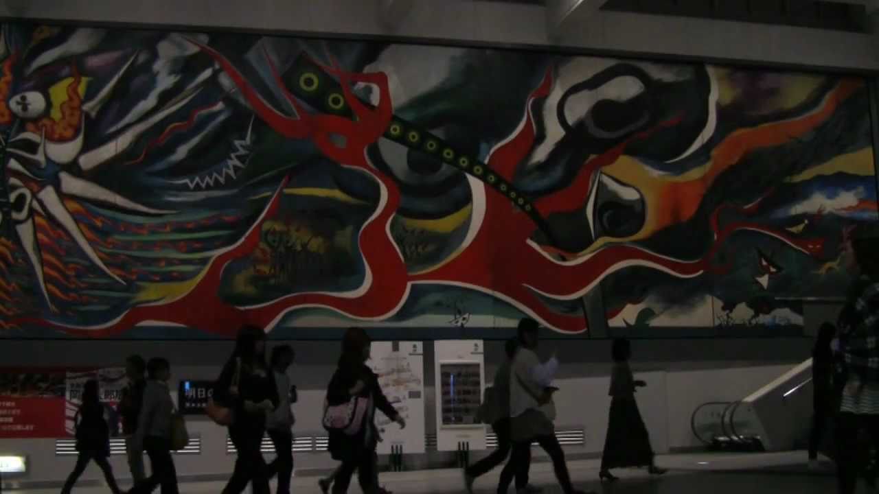 While the mural Myth of Tomorrow was completed by 1969, the Mexican hotel for which Okamoto’s mural was commissioned, originally scheduled to open in time for the 1968 Mexico City Olympics, remained incomplete. The mural was installed in the hotel lobby but the building was never completed. Suarez himself encountered financial difficulties before dying in 1987. The incomplete hotel was sold to a developer and the mural went missing. It was only rediscovered in 2003, more than thirty years later, by Okamoto Tarō’s life partner, Okamoto Toshiko, in a construction company storage yard outside Mexico City.25 Toshiko spearheaded a campaign in Japan to raise funds to purchase the mural and bring it back to Japan for restoration.26 It was finally hung in its current location in Shibuya station in 2008.27