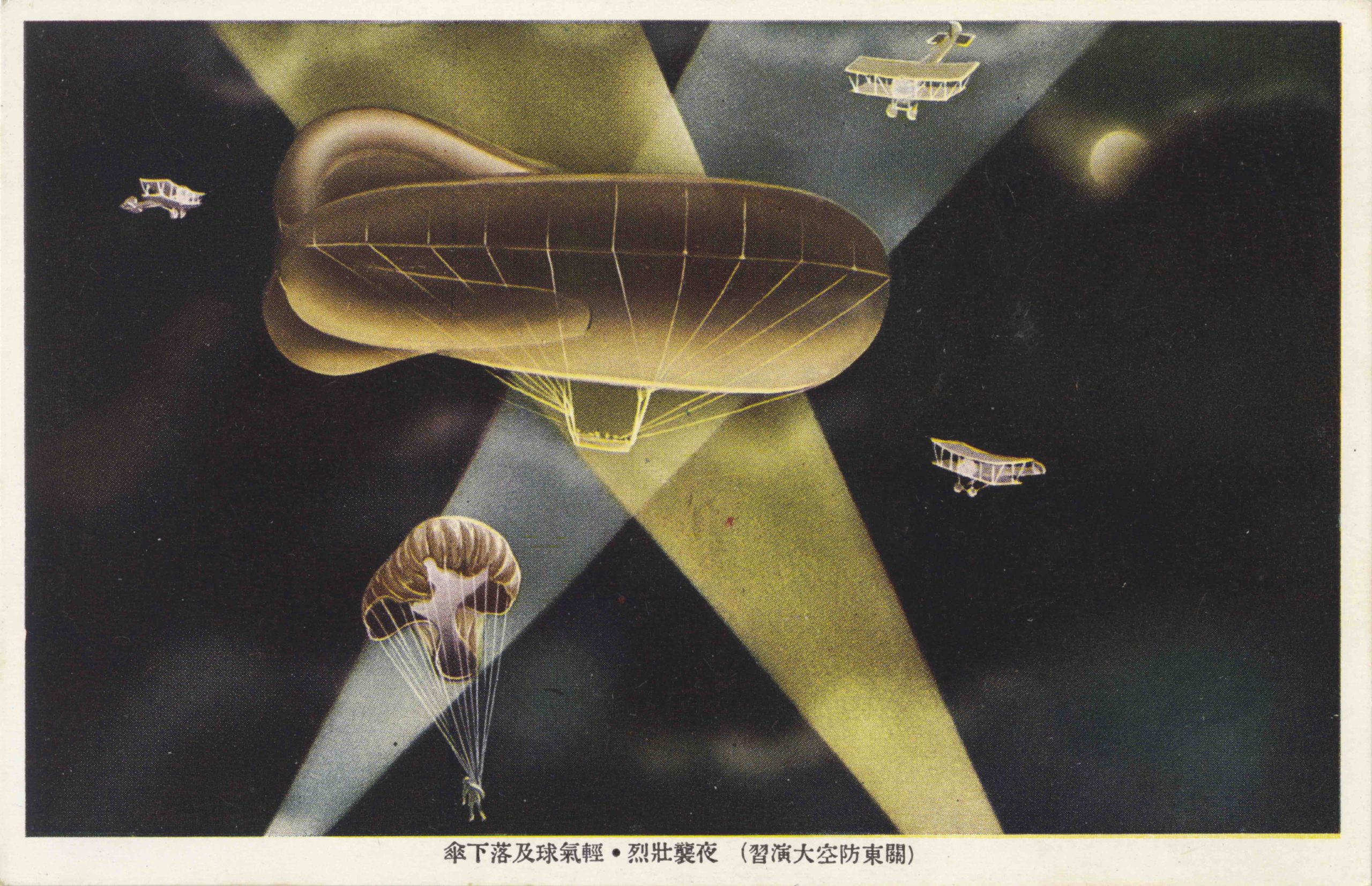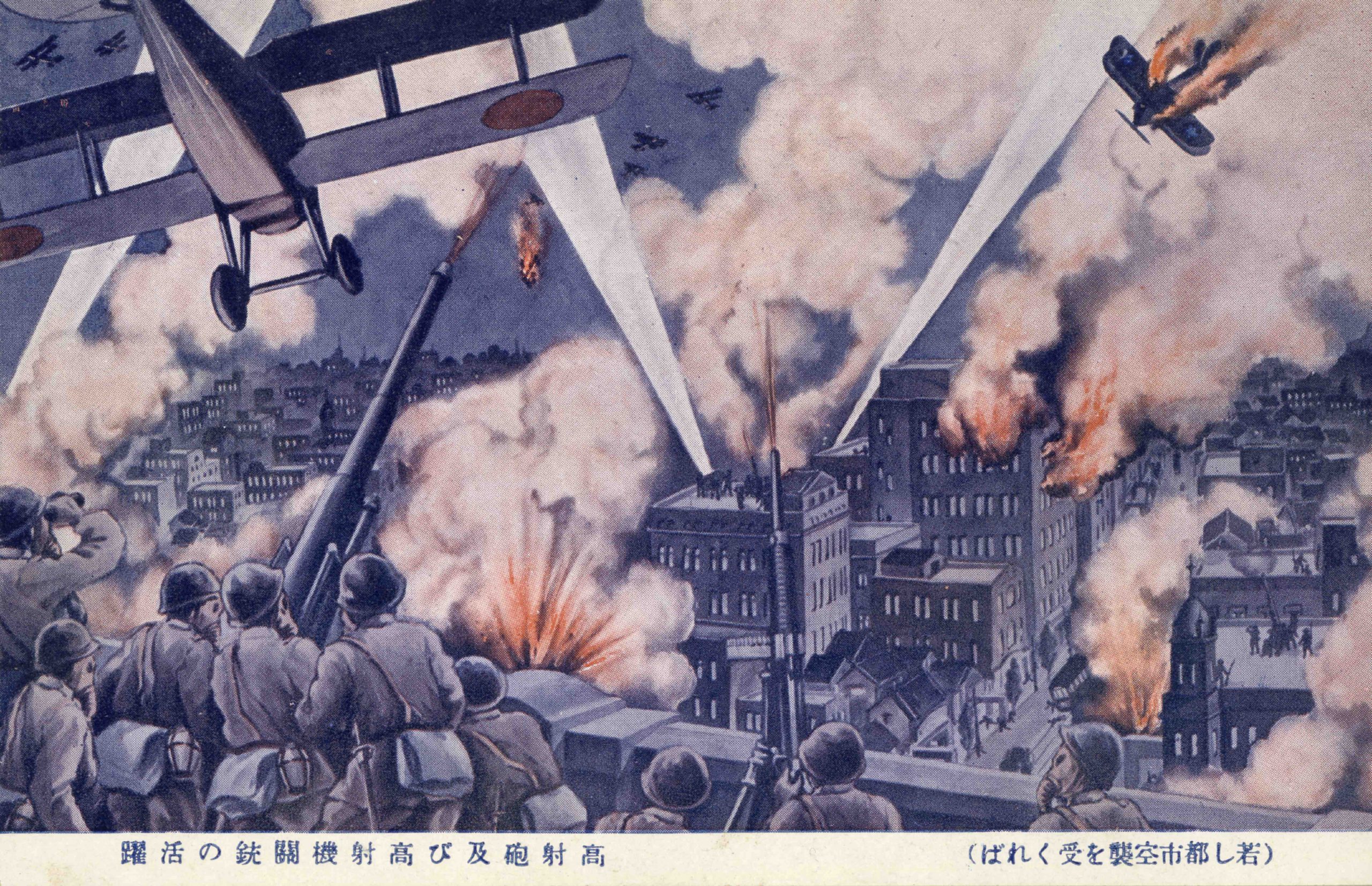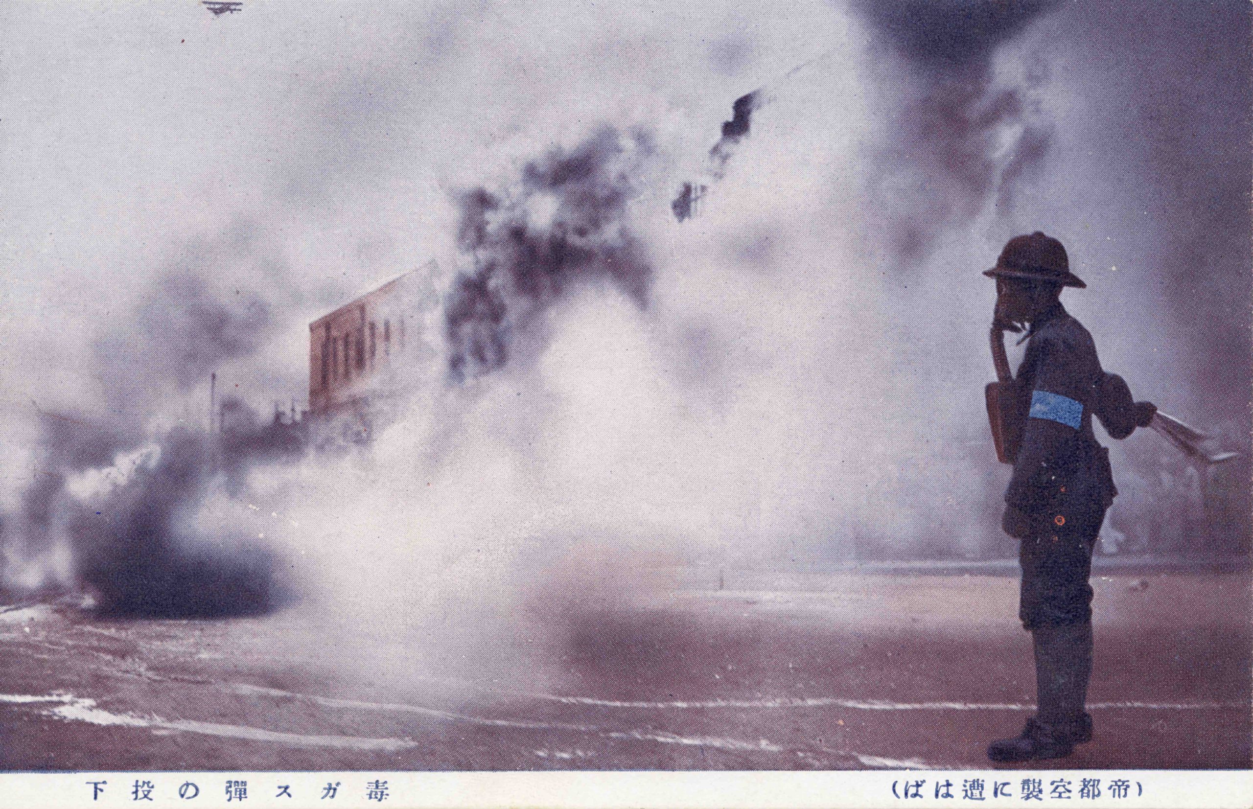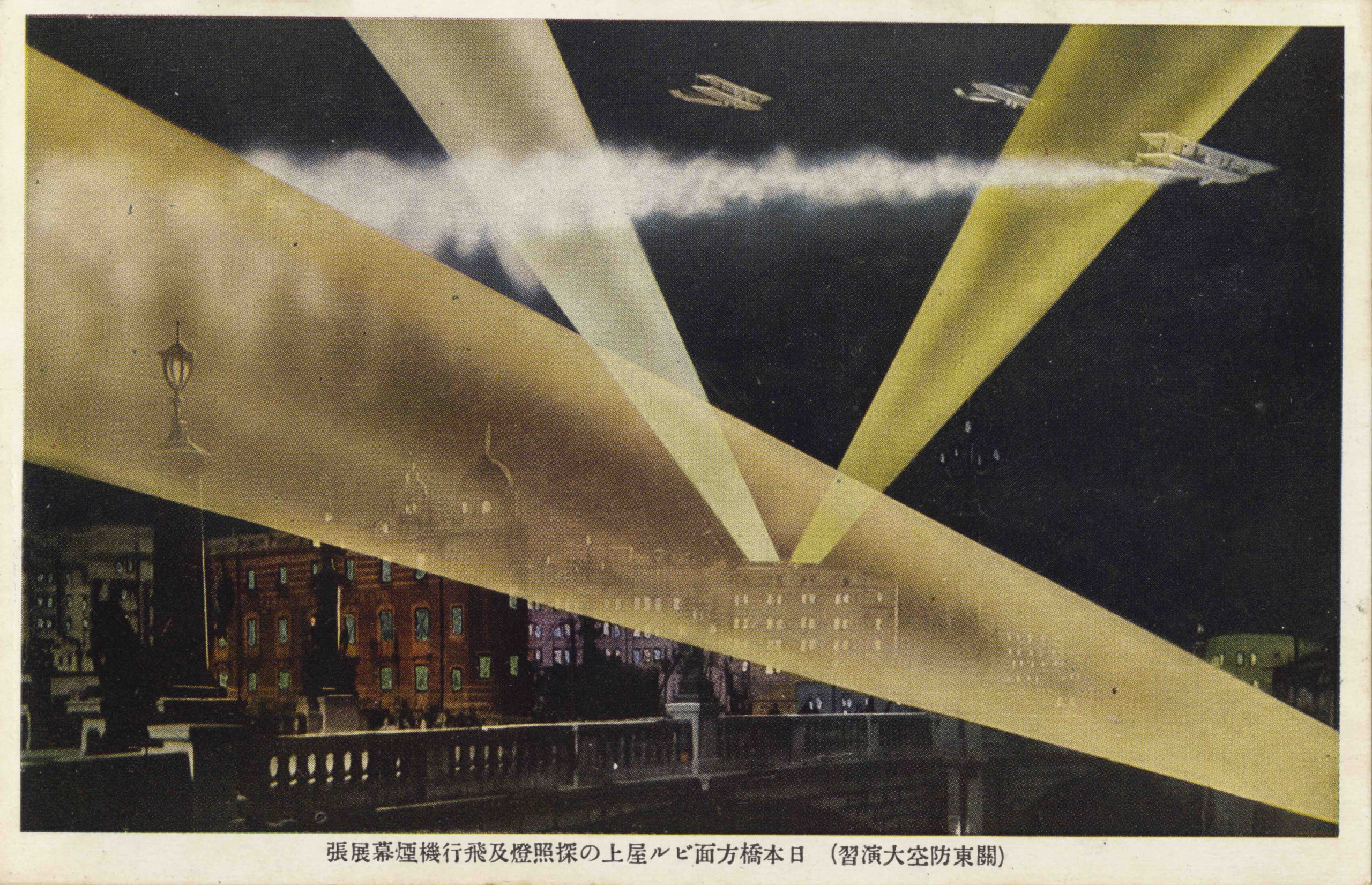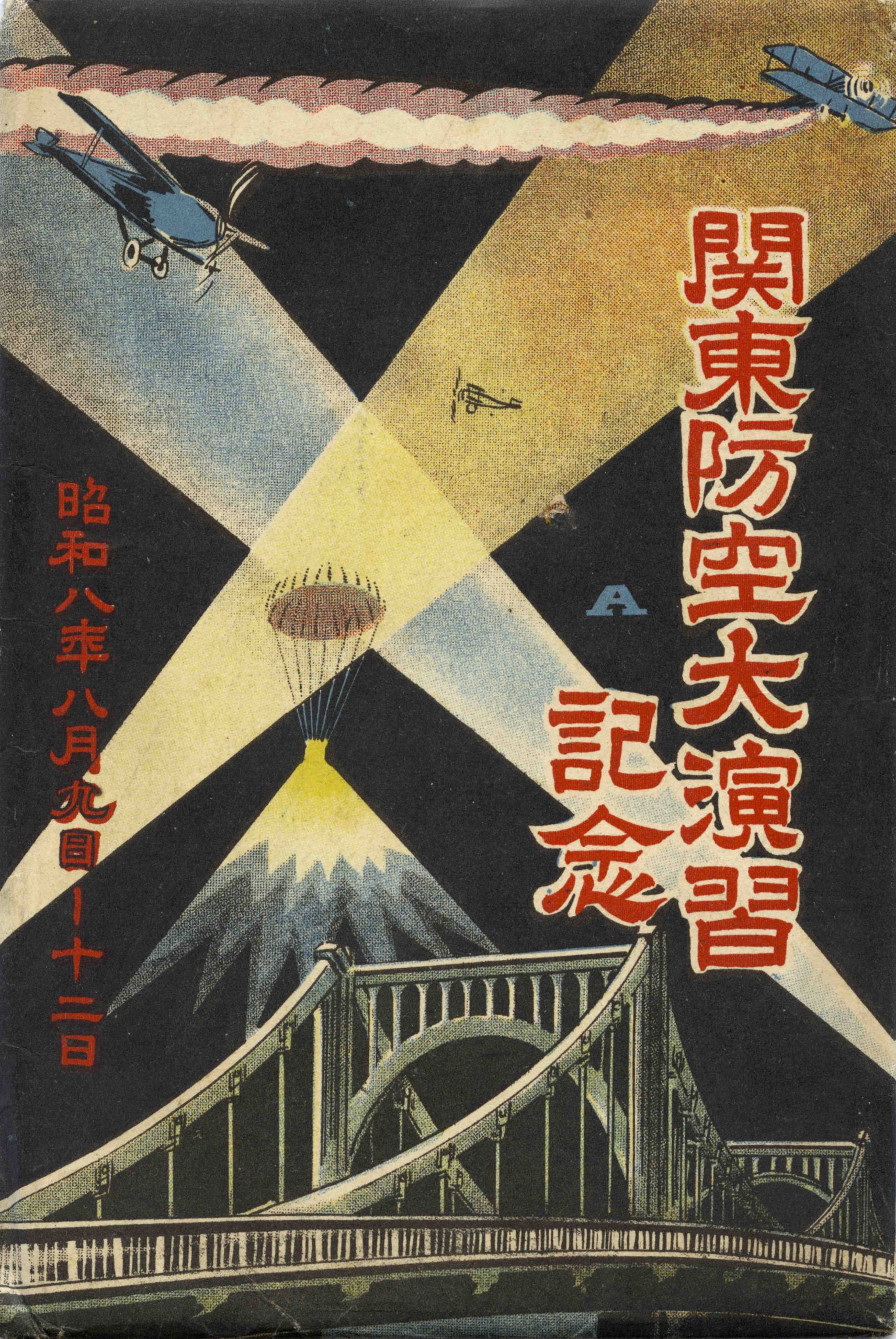 Tokyo held a major regional defense exercise from August 9 to 11, 1933, less than six months after Japan withdrew from the League of Nations to protest being officially censured for its activities in Manchuria. The event was billed in the press as fundamentally different from previous exercises because it would simulate āreal battleā conditions employing both military and civilian defense corps. In conjunction with these drills, entrepreneurs and official organizations issued sets of commemorative postcards employing dramatic aesthetics and catering to a burgeoning consumer market for bÅkÅ« memorabilia as collectibles. Below I will expand on three sets of postcards issued as souvenirs for the 1933 Great KantÅ Air Defense Drills and after. These visual souvenirs depict a bÅkÅ« visual canon that appeared widely across all media genres. As part of the larger campaigns for air defense itself, they tapped into the exciting, and often darkly enticing, visual rhetoric of national defense by deploying what I have termed its āobjects of attractionā: airplanes, gas masks, bombs, and all the wondrous weapons of war.