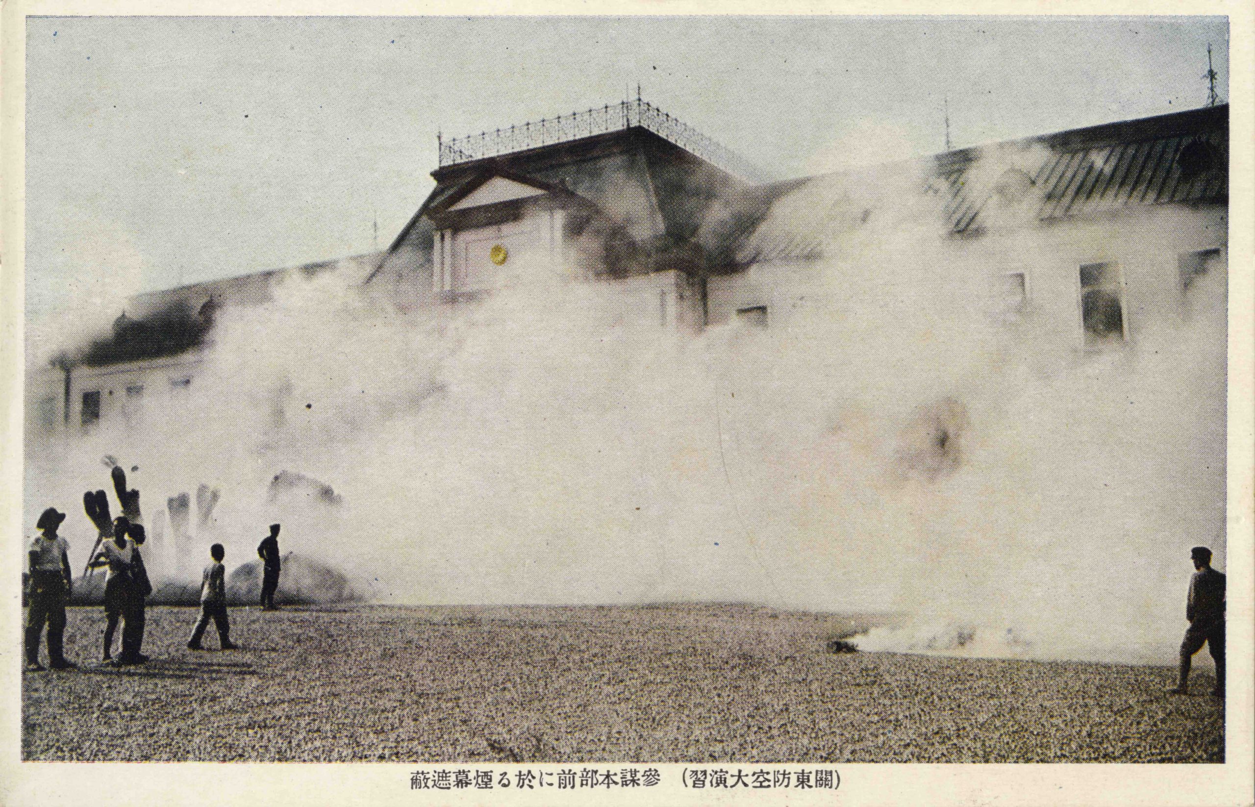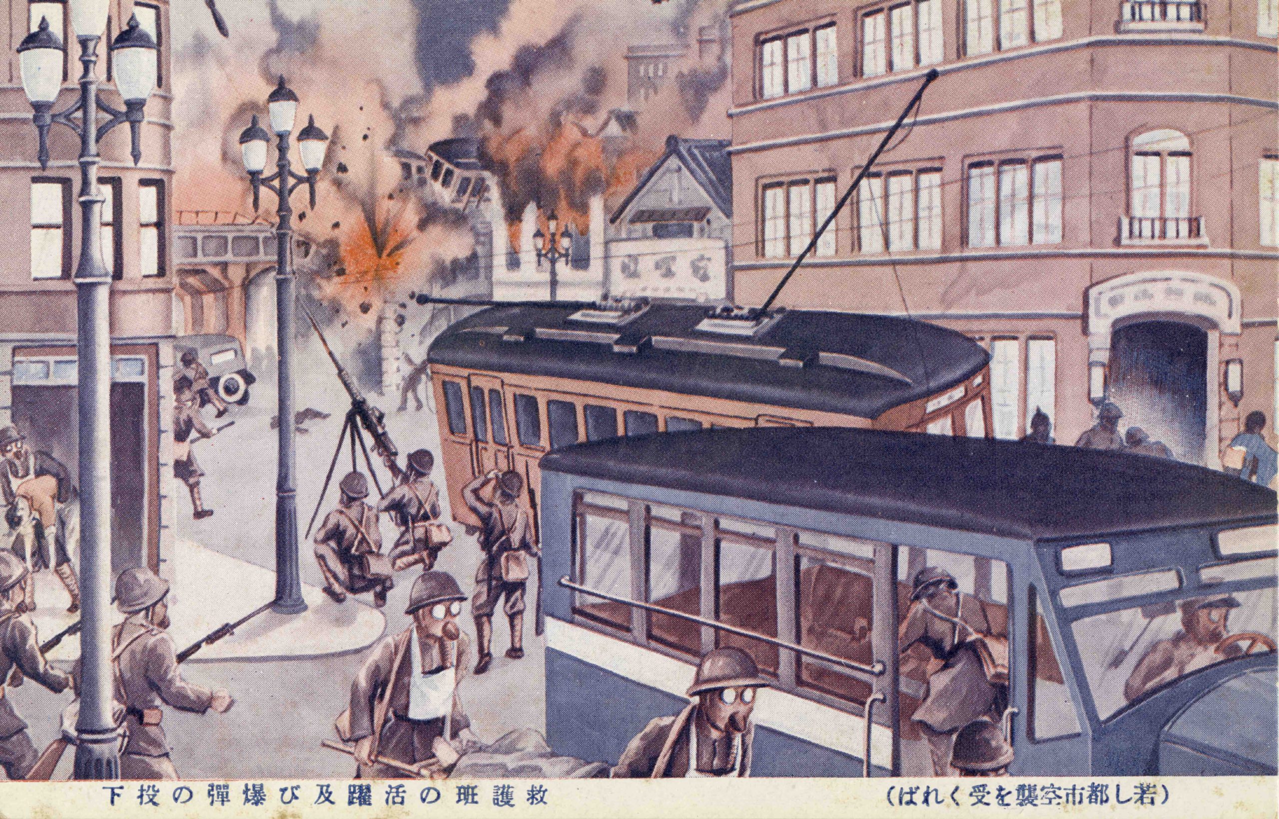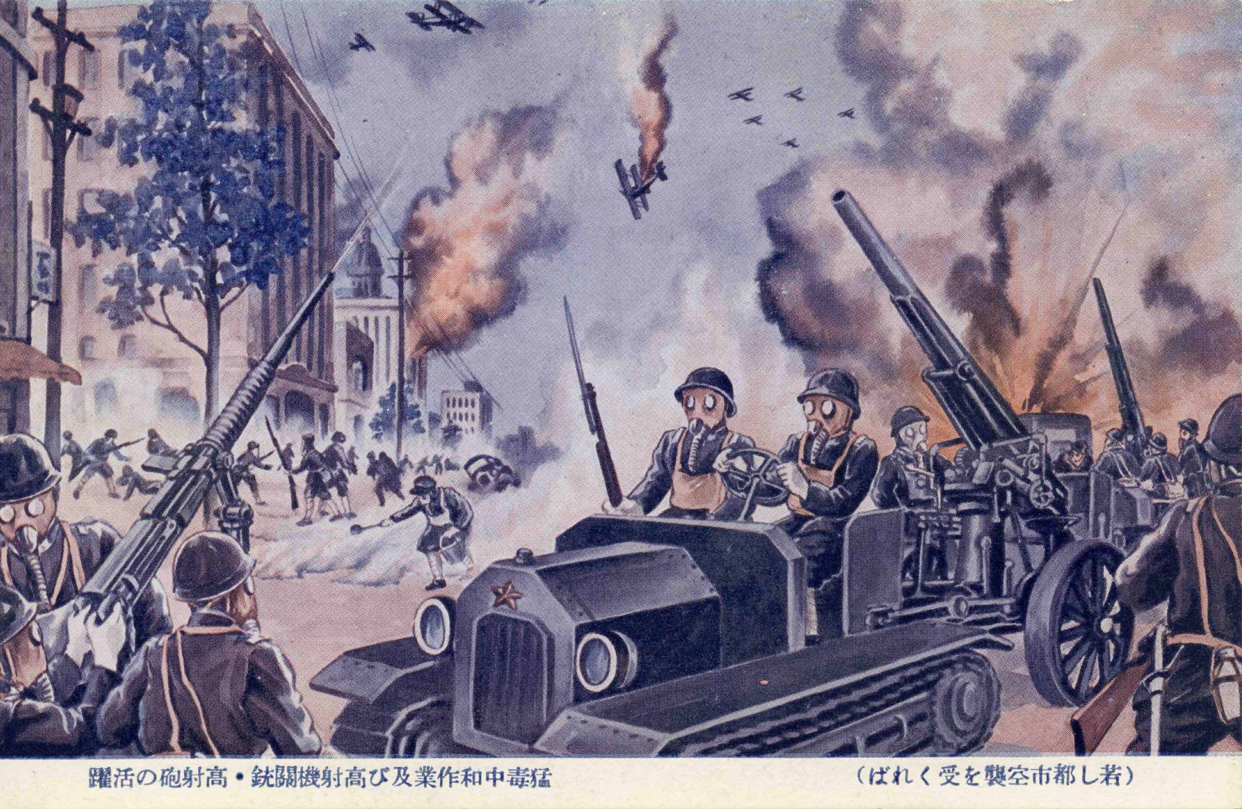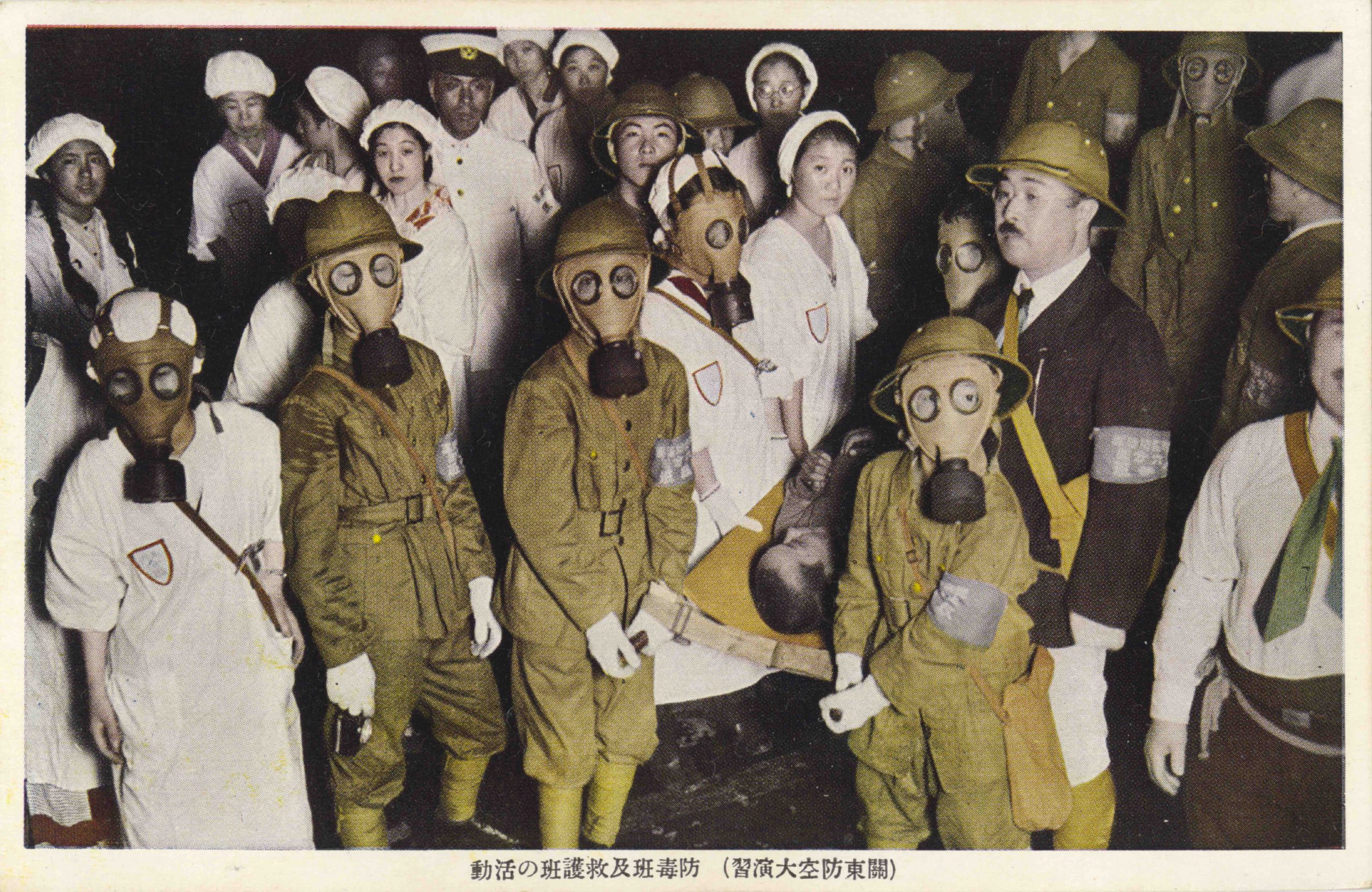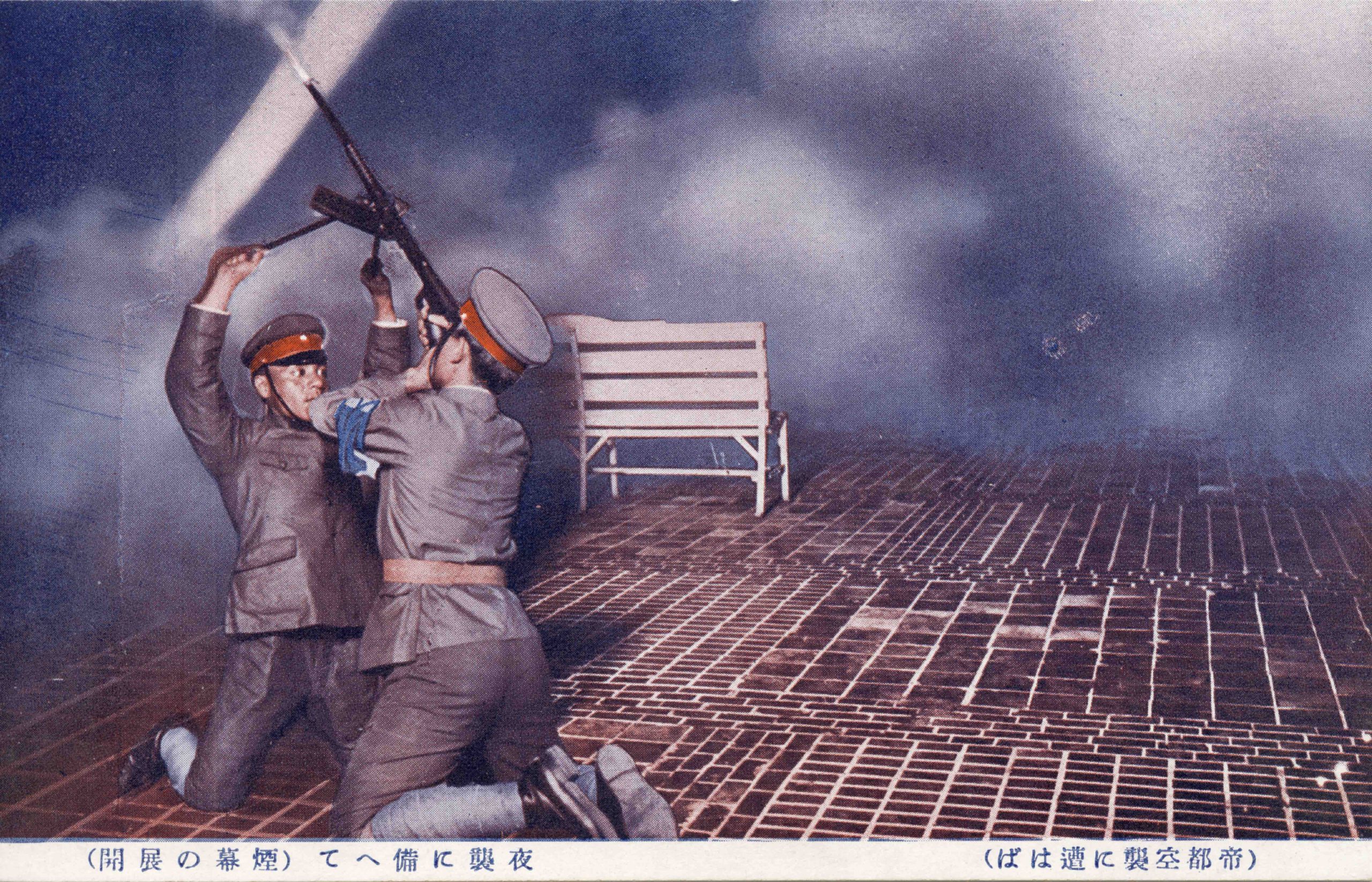 Tokyo held a major regional defense exercise from August 9 to 11, 1933, less than six months after Japan withdrew from the League of Nations to protest being officially censured for its activities in Manchuria. The event was billed in the press as fundamentally different from previous exercises because it would simulate āreal battleā conditions employing both military and civilian defense corps. In conjunction with these drills, entrepreneurs and official organizations issued sets of commemorative postcards employing dramatic aesthetics and catering to a burgeoning consumer market for bÅkÅ« memorabilia as collectibles. Below I will expand on three sets of postcards issued as souvenirs for the 1933 Great KantÅ Air Defense Drills and after. These visual souvenirs depict a bÅkÅ« visual canon that appeared widely across all media genres. As part of the larger campaigns for air defense itself, they tapped into the exciting, and often darkly enticing, visual rhetoric of national defense by deploying what I have termed its āobjects of attractionā: airplanes, gas masks, bombs, and all the wondrous weapons of war.