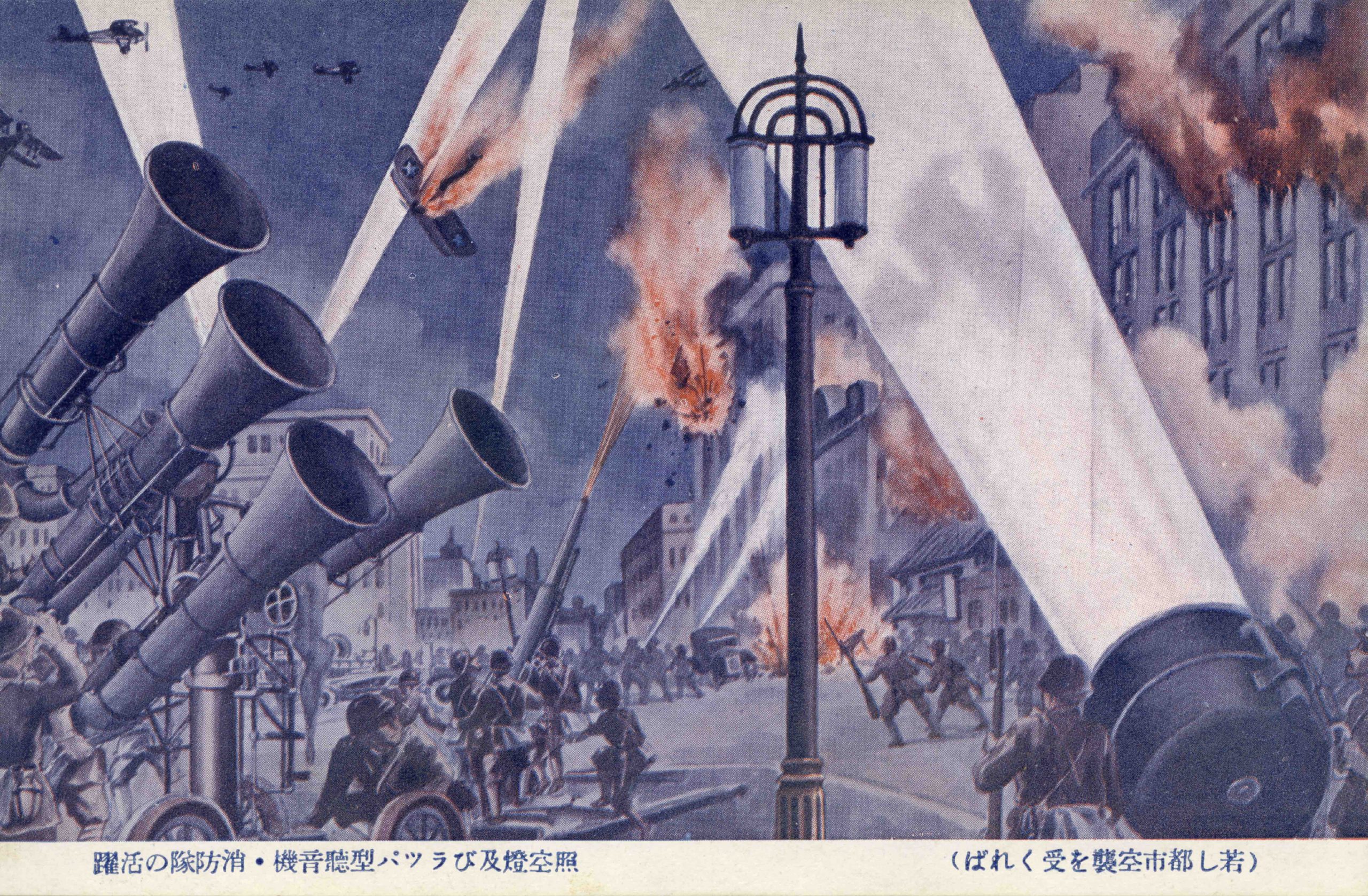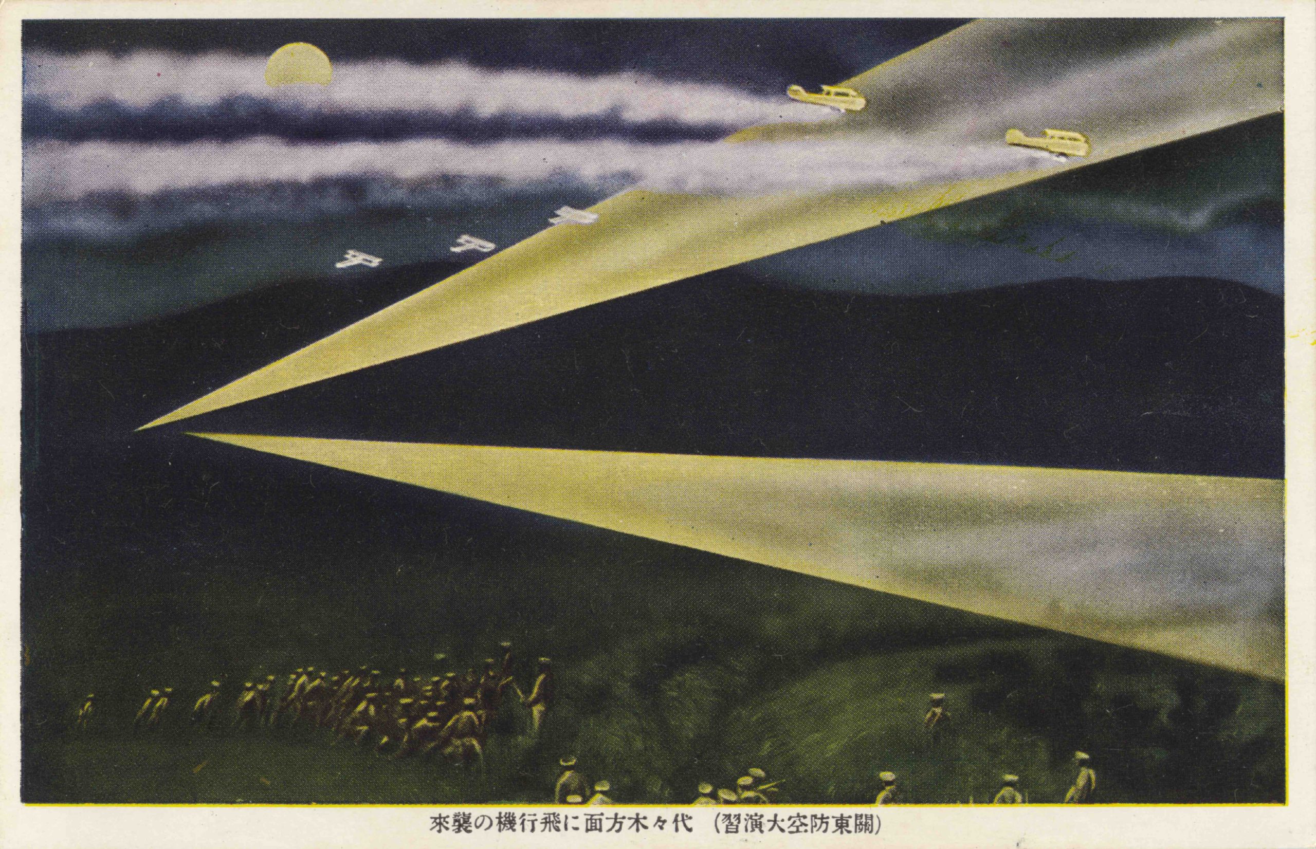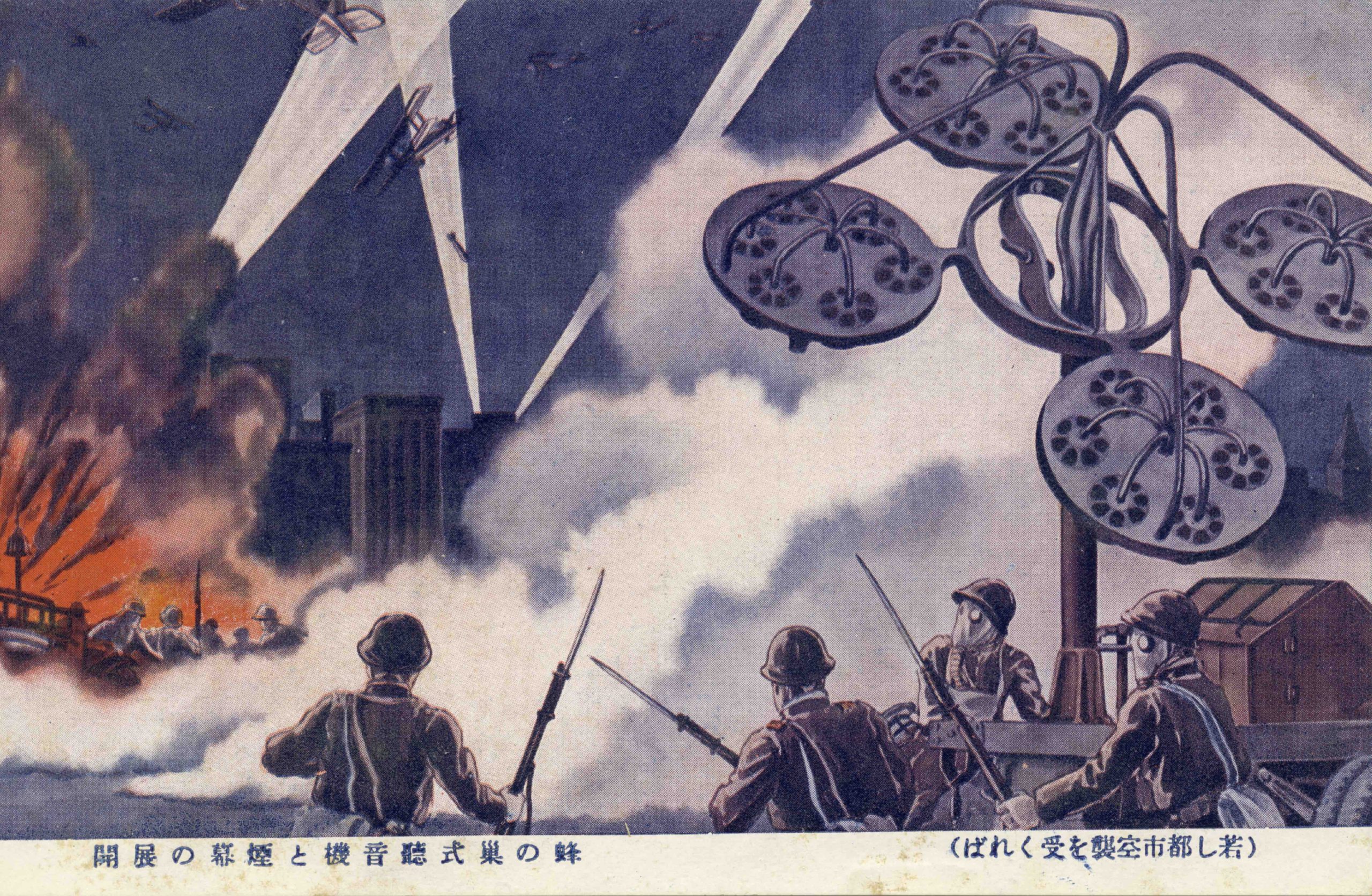 Symbols of power and dominance, airplanes were transcendentally beautiful. In fact, airplanes dominated the early twentieth-century visual field across the world. They were sublime objects appreciated both for their aesthetic qualities as well as for their technological marvels. They feature prominently in the visualization of air defense as scientific wonders and phantoms of death. In the early 1930s, speculative fiction air-defense novels portraying future war became a popular literary genre. This was just one subgenre of popular literature that a broad audience read eagerly. Postcards depicting air defense drills channeled speculative and science fiction in depicting the war of the future. This included bombs, barrage balloons, antiaircraft guns, searchlights, āthe eyes of the air-defense war,ā and large tuba- or disc-shaped acoustic locators (chÅonki), āthe ears of the air-defense war,ā devices for amplifying the sound of approaching enemy aircraft. This panoply of instruments of defense and destruction were objects of wonder.