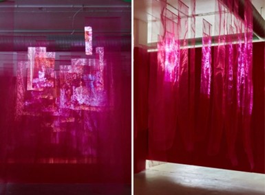 The pink panels are made of polyester organza, so it’s not a precious material. It’s also a lot tougher than a thin silk organza, and it gives more of a sheen and a glitter when the projector is on it. I wanted it to shimmer almost like water, for it to feel a little bit unreal as well. If you looked from outside or inside, it was always broken. No single face could really show. I don’t think brokenness is good or bad, it just is. Things are fragmented, even for people back in Taiwan, because they also have complex identities. The fragmentation doesn’t end.