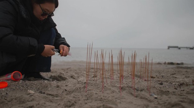 Grace: I burned a thousand sticks in total by the sea. It was inspired by Chinese and other East Asian traditions of incense burning at the Mid-Autumn festival associated with ancestor worship; this work creates a space for remembrance and contemplation.