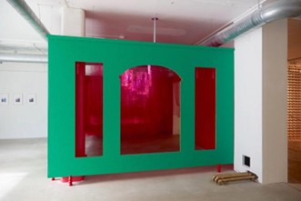 Grace: The other half of the title is in Taiwanese dialect. I think it’s the dominant dialect, but not a lot of people speak it anymore, because it’s considered low-class or old school. The work was about my mom’s mom when she passed away in the States. She died in New York. Her place used to have a Buddhist shrine, which was later removed by my aunt, who was Christian. I had no words for how angry I was. I couldn’t stop fixating on this one part of the wall that used to have that Buddhist shrine. I thought if I could imagine if that part of the wall could be a portal, to some other space, a softer space, or a space that can hold everything, both the grief and all the things that were possible because of the different steps each of us has taken in this country. The wooden structure, painted in green here, was inspired by that Buddhist portable shrine at my grandmother’s place.
